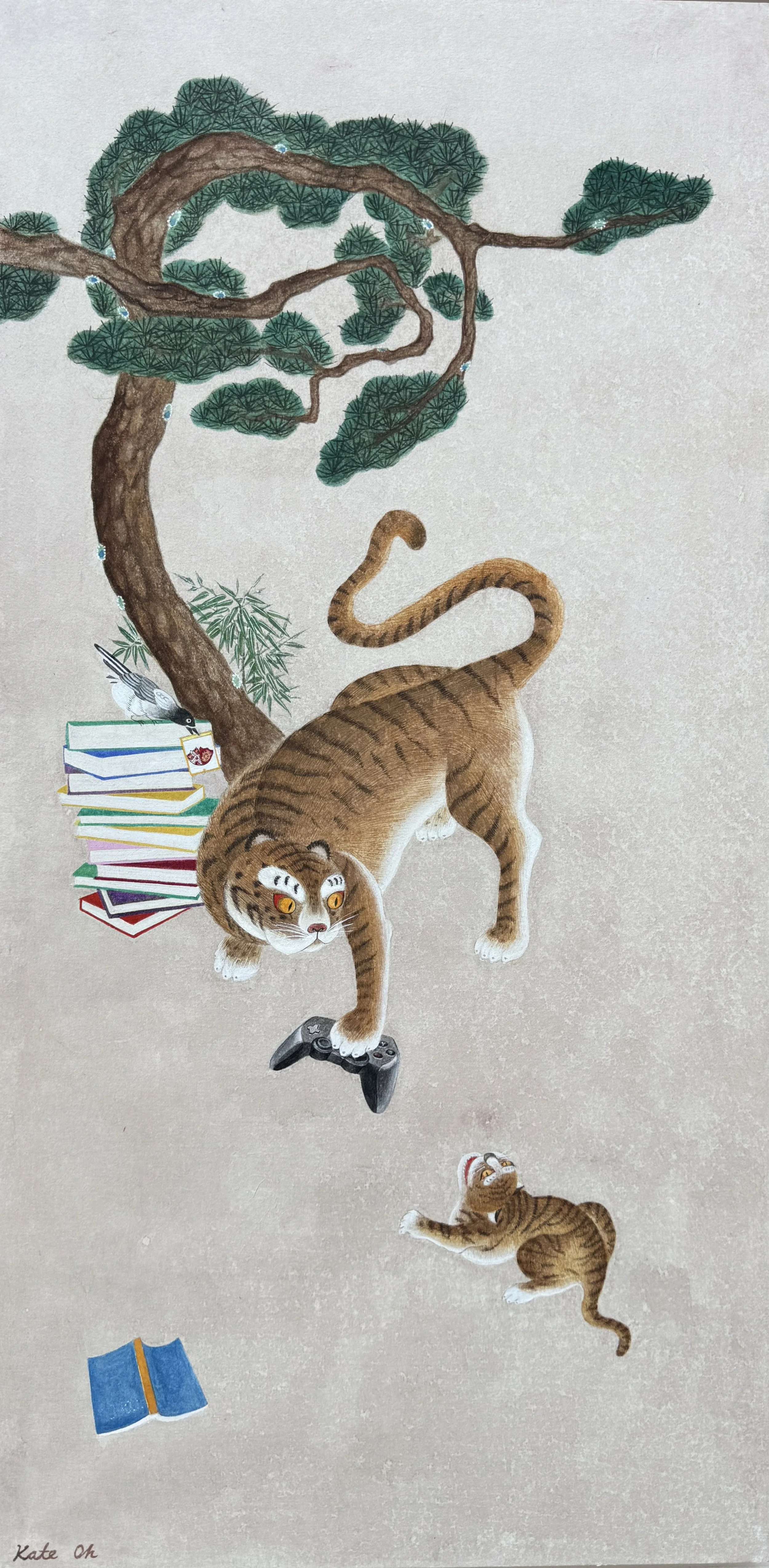 Kate Oh has, for much of her art practice, been a loyal practitioner of Minhwa painting. A mode of Korean folk art popularized the late Joseon era (specifically, from the 17th to 19th century), Minhwa painting draws on Korean mythology and theology. It is often regarded as a strictly ornamental practice due to its utilitarian use. However, overemphasizing the decorative belies Minhwa’s symbolic elements, which are complex, deeply narrative, and of a piece with the social and cultural subtending history that undergirds the genre’s emergence and rise to popularity. The Minhwa style and motifs reflect the spirit of the Korean populous as, during the 19th and 20th centuries, Minhwa burgeoned in popularity under a growing merchant class. Until the middle period of the Joseon Dynasty, Minhwa paintings were created by court specialists, with these works intended to adorn grand palaces. Given the epochal socioeconomic shifts that took place during the 19th century, artists of lower socioeconomic classes began working in the Minhwa tradition. In turn, the works became accessible for a wider collector class. This transformation also prompted thematic shifts, the most notable being a turn from mere ornament to narrative, isomorphic to the nascent mercantile class’s desire for a prosperous bourgeois life.